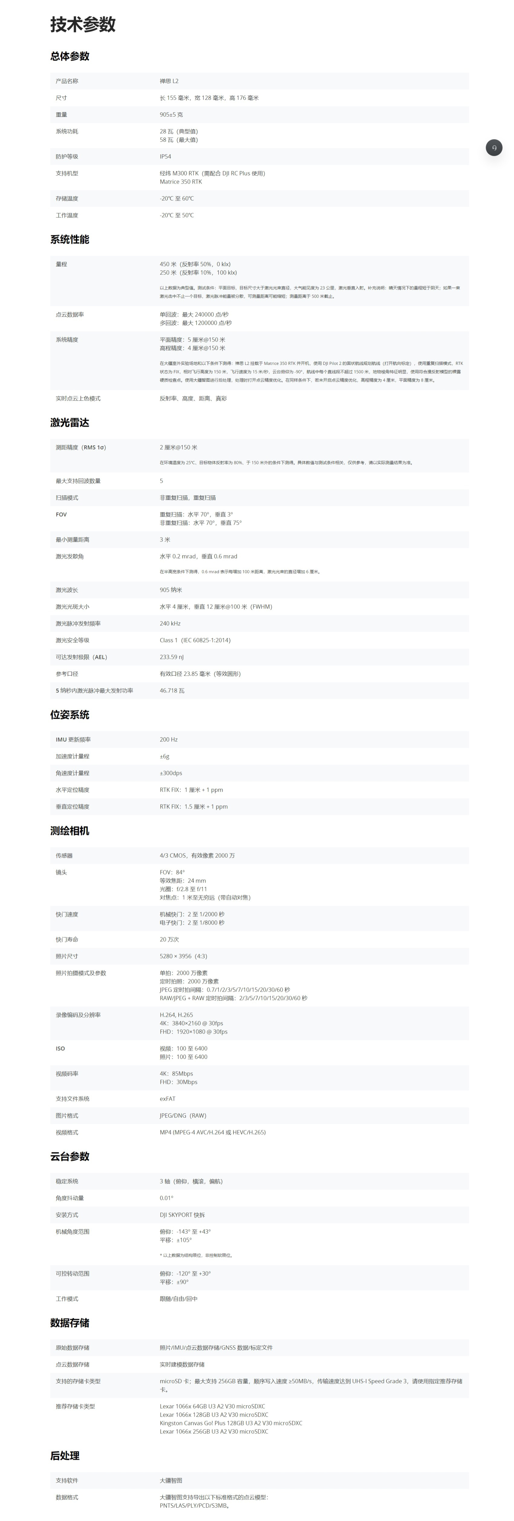 机载高精度测绘激光雷达禅思 L2 集成框幅式激光雷达、、、、高精度自研位姿系统和 4/3 CMOS 可见光测绘相机,,,赋予飞行平台更精准、、高效、、、可靠的维数据采集能力,,,配合大疆智图,,,即可构建三维数据获取和高精度后处理一体化解决方案。。