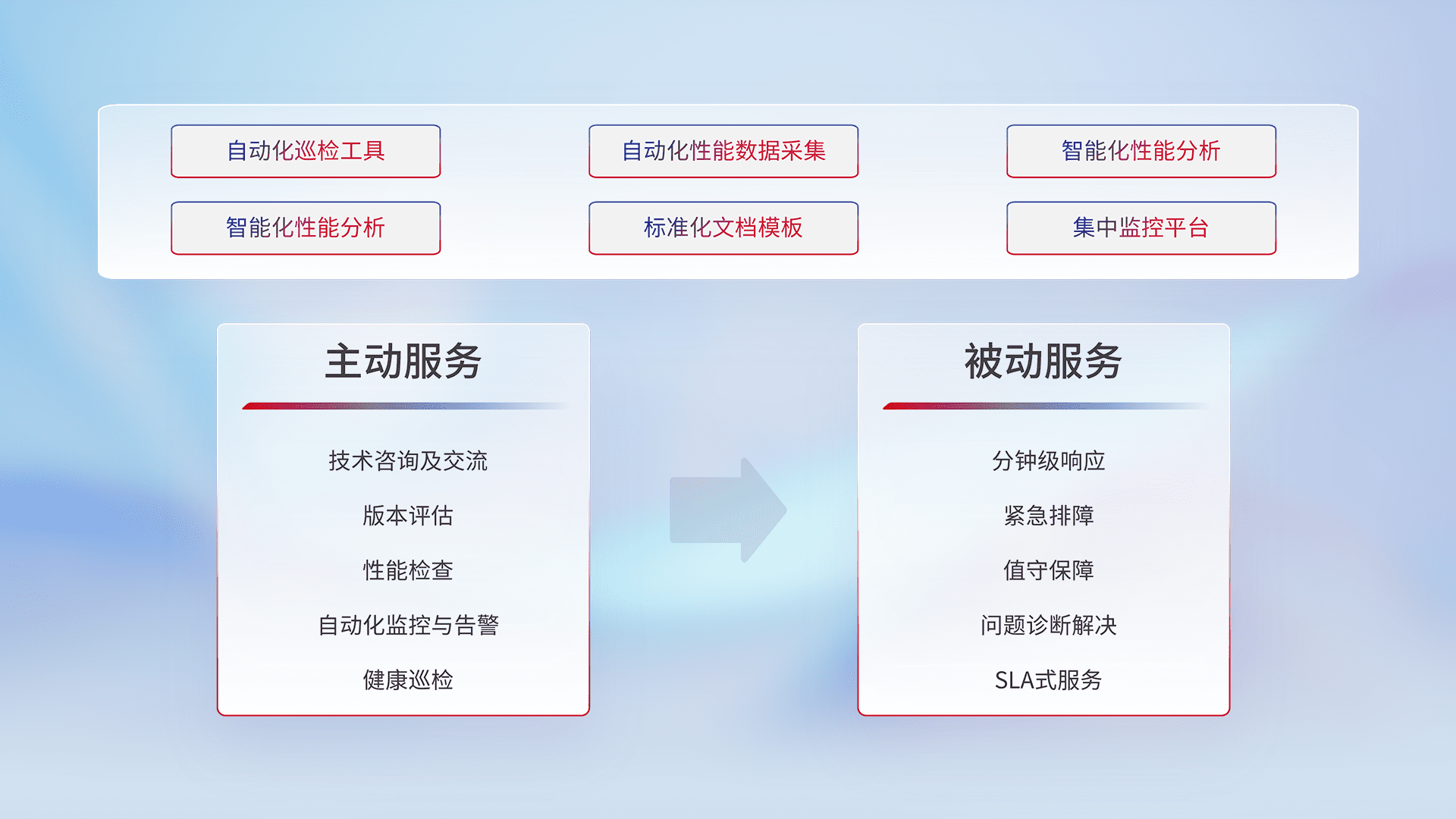 智能化工具和标准化文档,,保障服务质量,,,,提供主动服务(包含技术咨询、、、、版本评估、、、、性能检查、、、自动化监控与告警、、、、健康巡检)和被动服务包含(分钟级响应、、、、紧急排障、、、值守保障、、问题诊断解决、、、SLA服务)。。。。